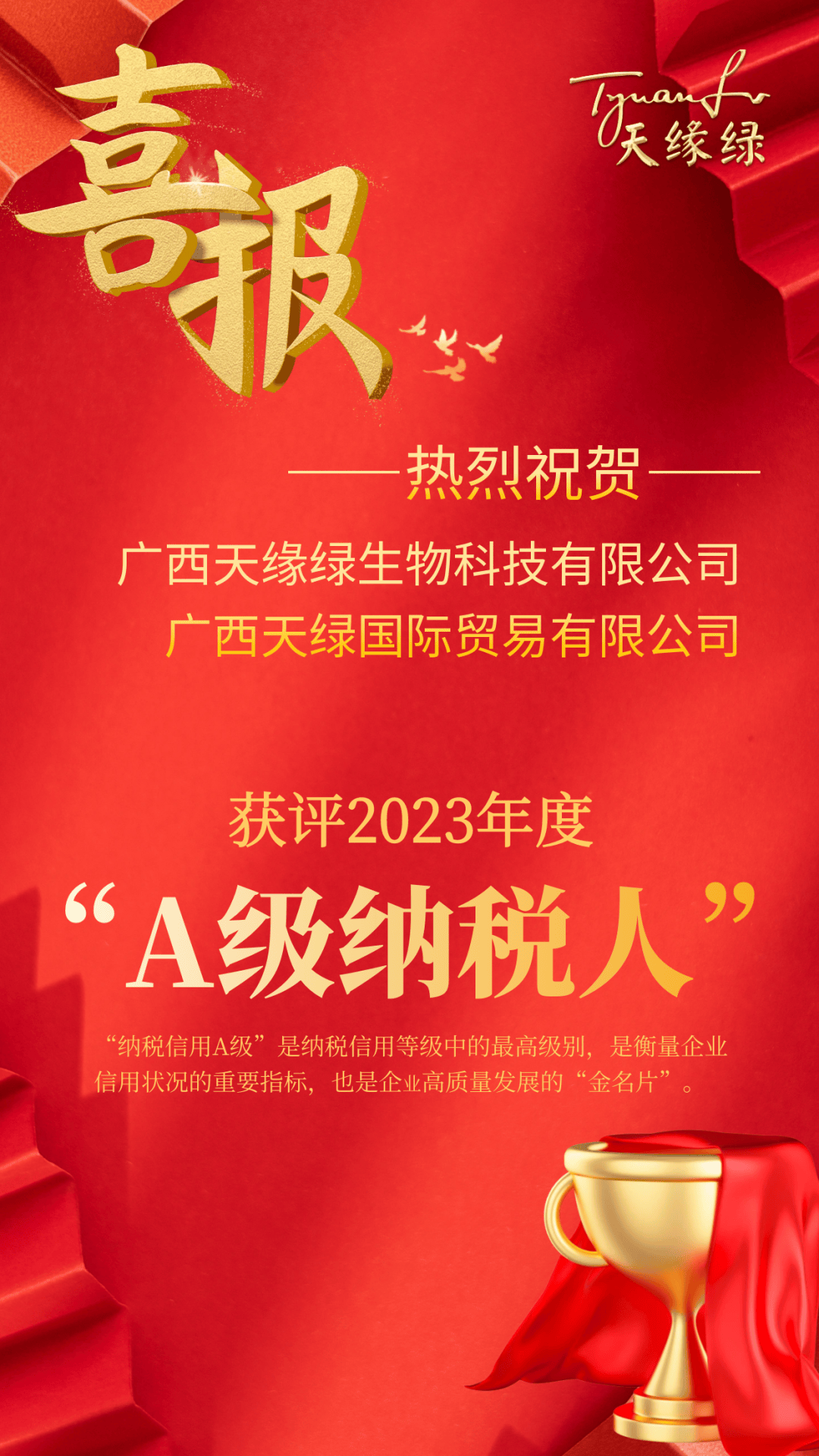 喜報(bào)!天緣綠集團(tuán)母公司及子公司獲評2023年度納稅信用A級納稅人